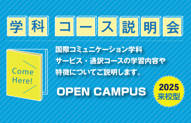 学科・コース説明会 国際コミュニケーション学科 サービス・通訳コースの学習 内容や特徴についてご説明します。質疑応答の時間をたっ…